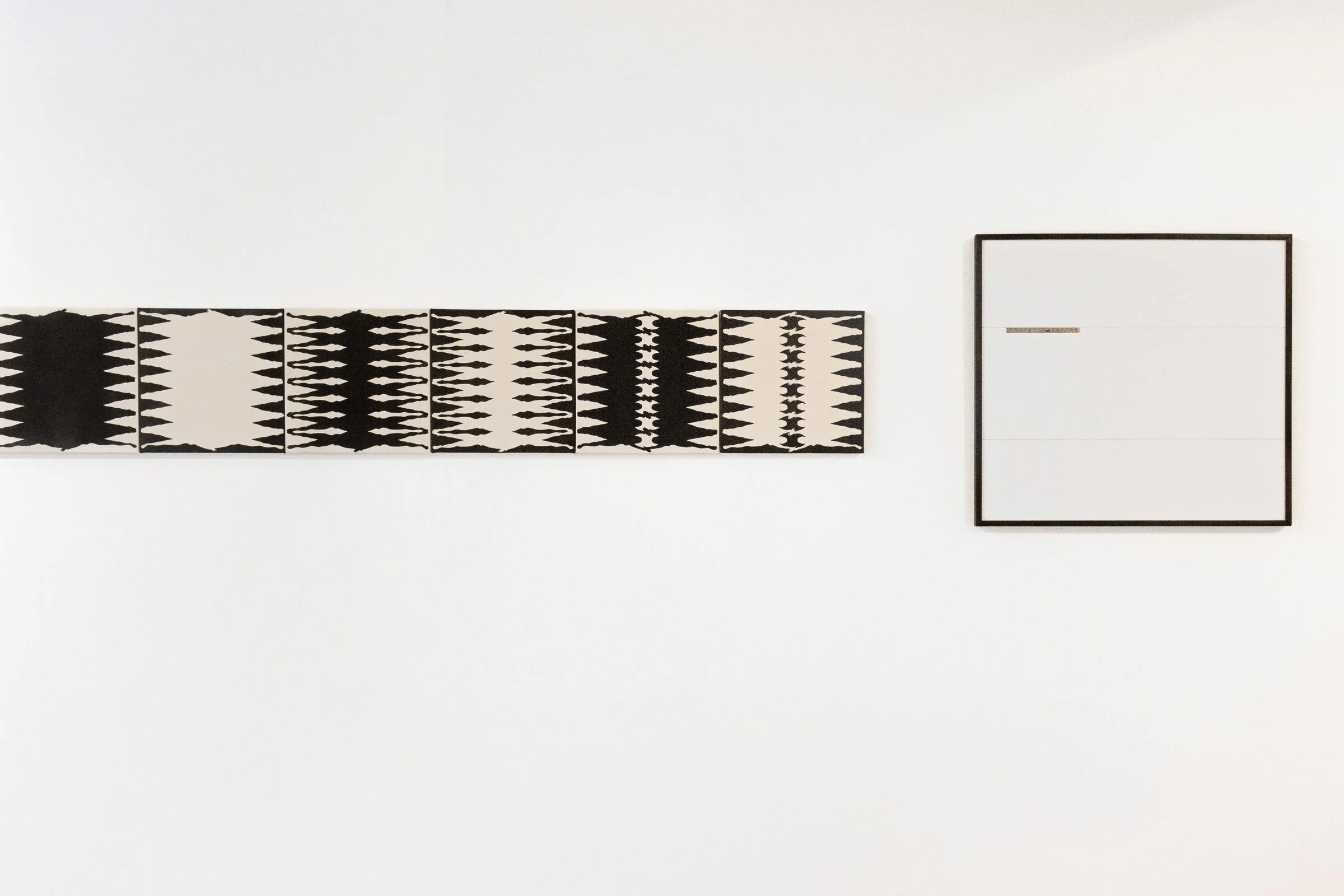 Carrying a black and white minimal look, How Much Is It No.2 is also mediated upon a giveaway frame. This time, Yang removed the protective glass, covered the mat board with the gallery's wall paint, and drew two parallel pencil lines across the framed area. The lower line stays as is, while a hardware store-bought metal ruler is placed on the upper line, emphasizing the act of measuring. The metal ruler is a reference for informational comparison, and it assigns a value to the line and (less directly) passes around the value system to its nearby elements.