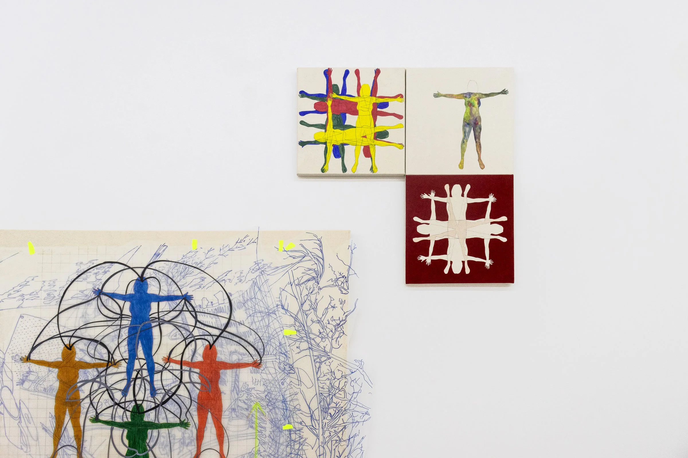 n+1 is a series of square-shaped paintings that was initiated in the summer. Square canvas allows image rotation and combination, similar to tile making. Other than acrylic paint, Yang incorporates risograph prints and yarn into some of the works, introducing tactile physicality to the "flatland" of the image. n+1 No.23 to No.29 reveal Yang's interest in a more abstract approach to using stencils and patterns. By making different painting iterations using one stencil of her body's silhouettes, Yang adopts the printmaking philosophy again, reconciling the positive and negative space. The outcome displays optical ambiguity, challenging subjective and objective knowledge, bridging her research direction into epistemology.
