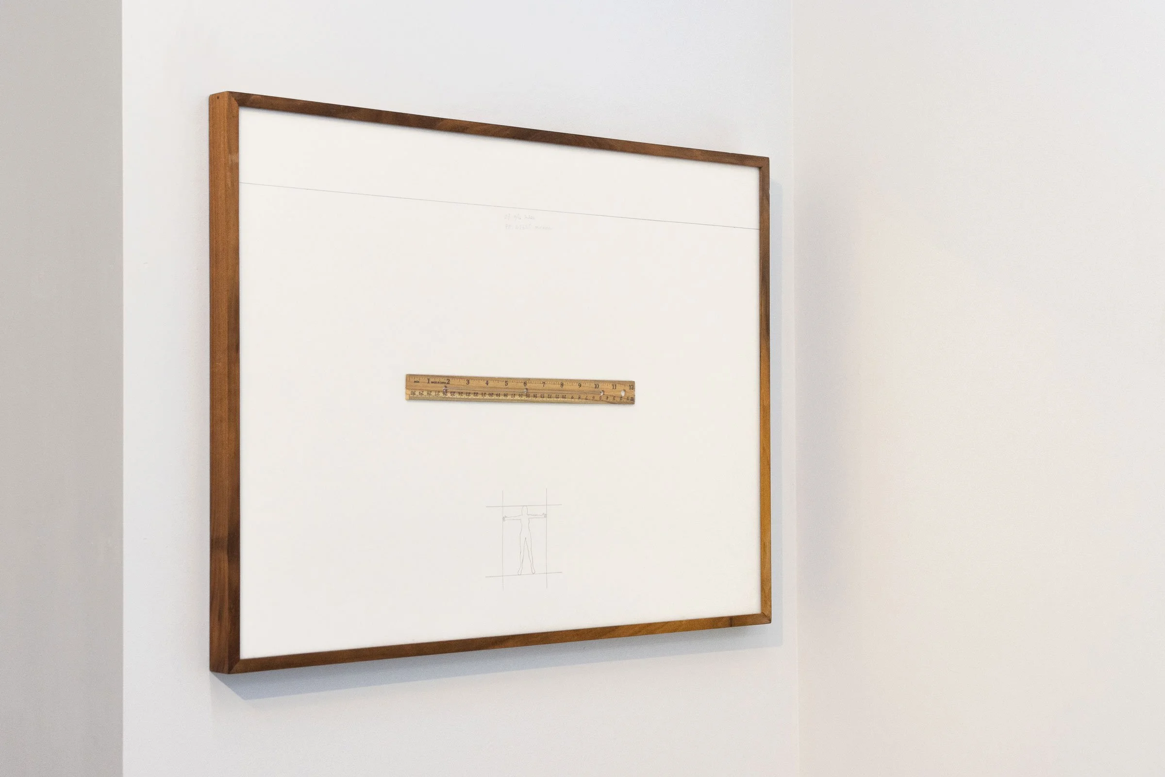 Among the artworks on display, How Much Is It No.1 is an instruction to Yang's method of using herself as the measurement. This drawing employs three elements from the subject: the measured existence, the measuring instrument, and the measurand (the result of measurement represented by Arabic numbers, imperial, and converted metric units here). This piece is made with a giveaway museum frame, which was passed to her by a friend. Yang based her mediation on the existing dimensions and indicated the width of the framed image ground with a pencil line. The line is labeled with written numbers "27 11/16 inches" and "70.32625 centimeters", results gained from measuring with a wooden ruler she bought in a convenience store. Yang fixed the ruler underneath the measurand and drew a diagram at the bottom of the page displaying her body being measured without indicating any final product. The palm-size diagram pinpoints the act of measuring a body and, due to its physical size, suggests the representativeness of scale in image-making. Importantly, this drawing marks a milestone in Yang's investigation of knowledge and reality.